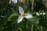During April many species of American woodland bulbs can be seen flowering throughout the garden. There are approximately 18 varieties of white or maroon Trillium (Wake Robin, Wood Lily) throughout the garden. They are easily recognised by their 3 leaves, sepals and petals. The graceful nodding white, yellow or pink flowers of Erythronium (Dog’s Tooth Violet, Trout Lily) are gradually spreading over the woodland floor and paths! There are lots of varieties of Daffodils, Fritillaries, Scillas, and Chionodoxas along with a clump of Anemone blanda near No 10. Wild Wood Anemones appear throughout the garden especially where the ground is less disturbed. On the edge of the lawn at the top of the garden, large stalks of last year’s Cardiocrinum giganteum (giant Himalayan Lily) which flowered in June/July can still be seen. Their glossy heart-shaped leaves are already bursting out of their bulbs.